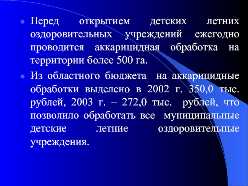 Из областного бюджета на аккарицидные обработки выделено в 2002 г. 350,0 тыс. рублей, 2003 г. – 272,0 тыс. рублей, что позволило обработать все муниципальные детские летние оздоровительные учреждения.