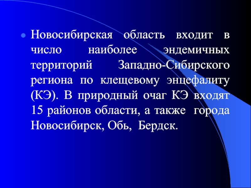 региона по клещевому энцефалиту (КЭ). В природный очаг КЭ входят 15 районов области, а также города Новосибирск, Обь, Бердск.