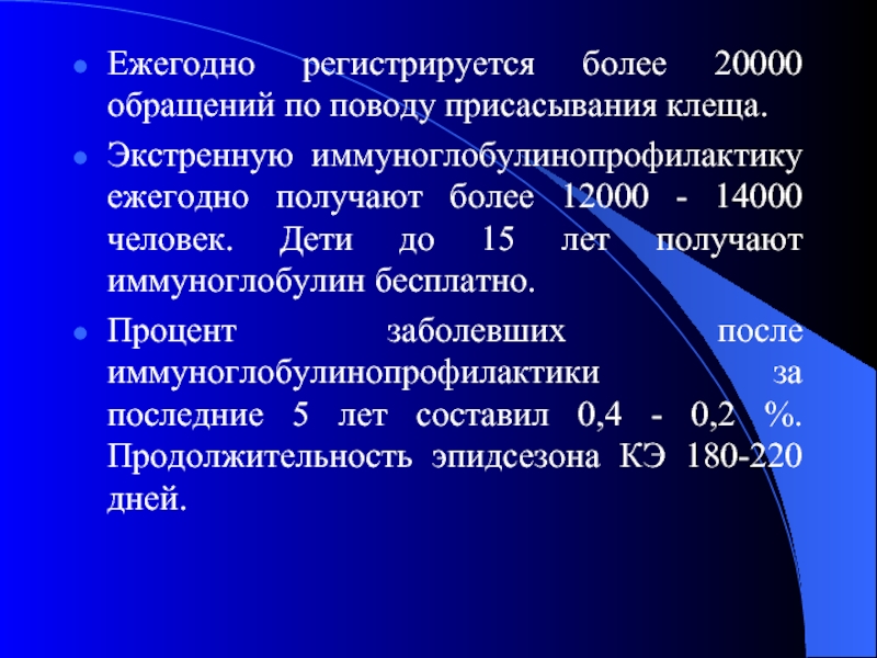 Слайд 8Ежегодно регистрируется более 20000 обращений по поводу присасывания клеща.