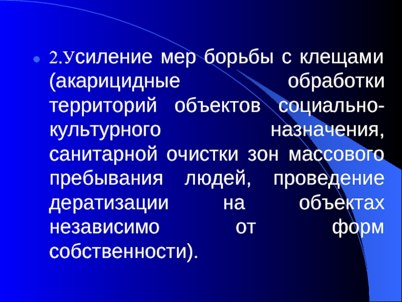 2.Усиление мер борьбы с клещами (акарицидные обработки территорий объектов социально-культурного назначения,