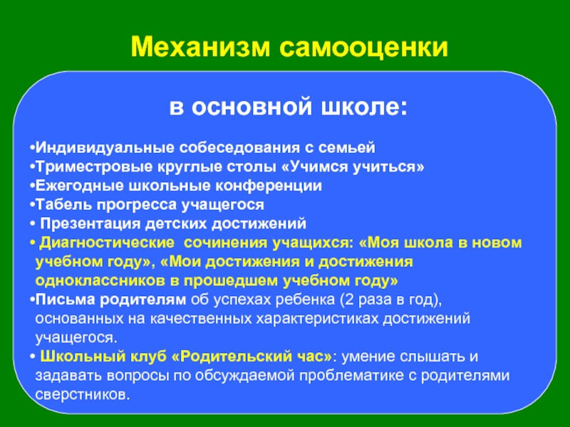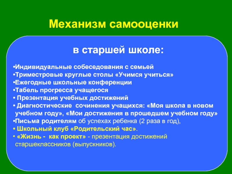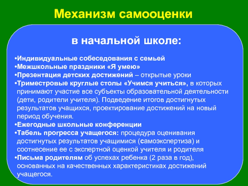 Триместровые круглые столы «Учимся учиться», в которых принимают участие все субъекты образовательной деятельности (дети, родители учителя). Подведение итогов достигнутых результатов учащихся, проектирование достижений на новый период обучения.