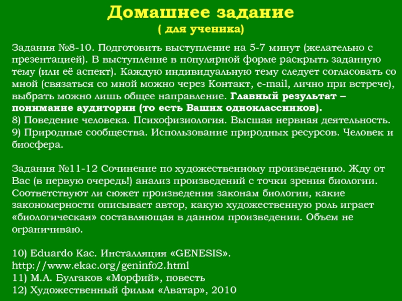 с презентацией). В выступление в популярной форме раскрыть заданную тему (или её аспект). Каждую индивидуальную тему следует согласовать со мной (связаться со мной можно через Контакт, e-mail, лично при встрече), выбрать можно лишь общее направление. Главный результат – понимание аудитории (то есть Ваших одноклассников).