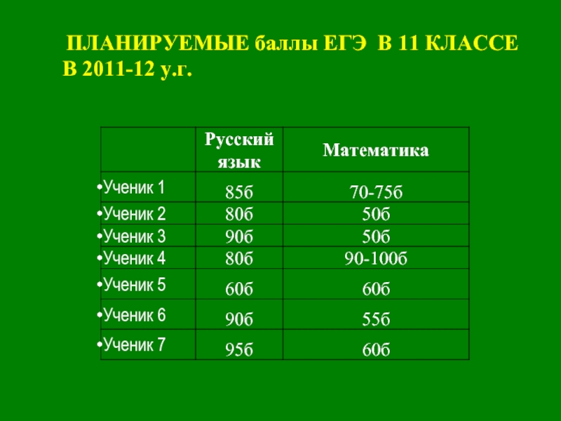 Слайд 25 ПЛАНИРУЕМЫЕ баллы ЕГЭ В 11 КЛАССЕ В 2011-12 у.г.