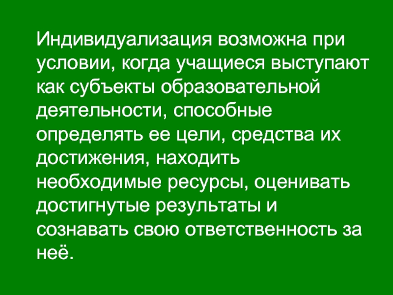 Слайд 10Индивидуализация возможна при условии, когда учащиеся выступают как субъекты образовательной деятельности,