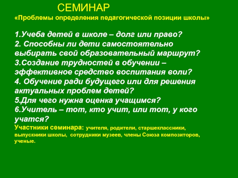 Участники семинара: учителя, родители, старшеклассники, выпускники школы, сотрудники музеев, члены Союза композиторов, ученые.