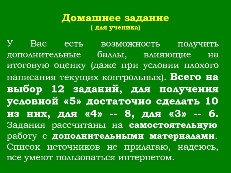 на итоговую оценку (даже при условии плохого написания текущих контрольных). Всего на выбор 12 заданий, для получения условной «5» достаточно сделать 10 из них, для «4» -- 8, для «3» -- 6.