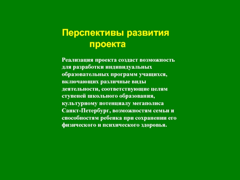Реализация проекта создаст возможность для разработки индивидуальных образовательных программ учащихся, включающих различные виды деятельности, соответствующие целям ступеней школьного образования, культурному потенциалу мегаполиса Санкт-Петербург, возможностям семьи и способностям ребенка при сохранении его физического и психического здоровья.