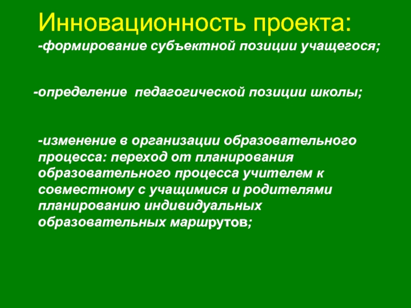 процесса: переход от планирования образовательного процесса учителем к совместному с учащимися и родителями планированию индивидуальных образовательных маршрутов;