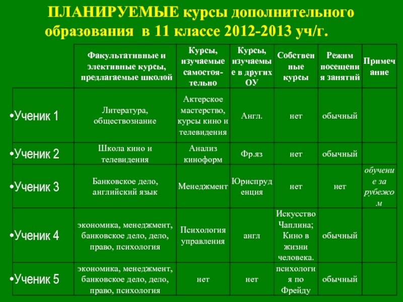 Слайд 26 ПЛАНИРУЕМЫЕ курсы дополнительного образования в 11 классе 2012-2013 уч/г.