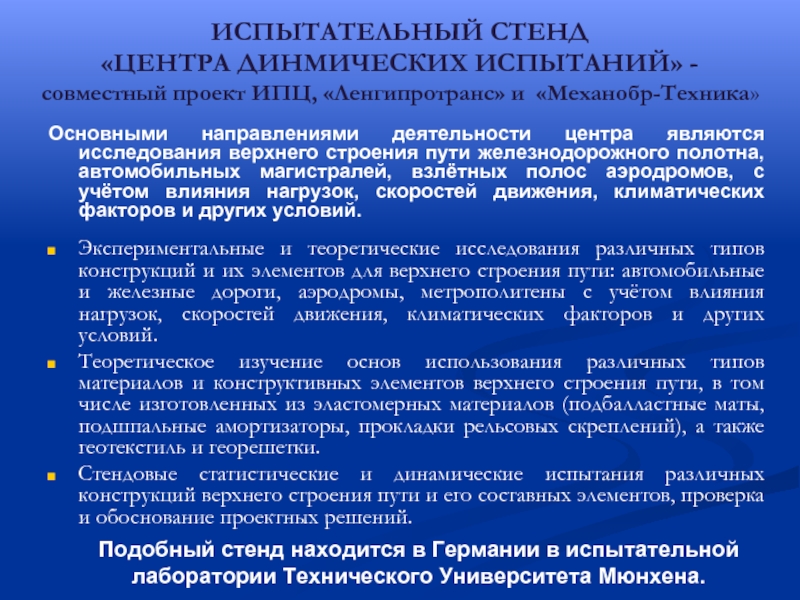 Стендовые статистические и динамические испытания различных конструкций верхнего строения пути и его составных элементов, проверка и обоснование проектных решений.