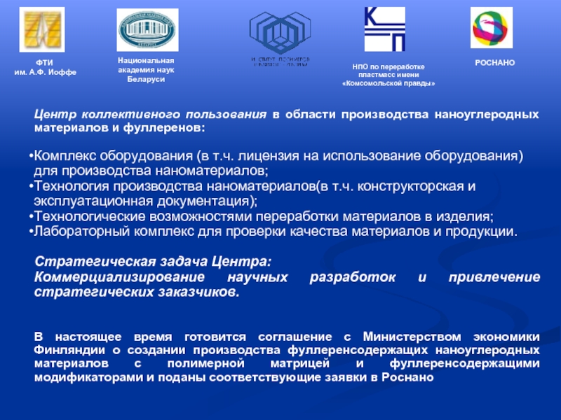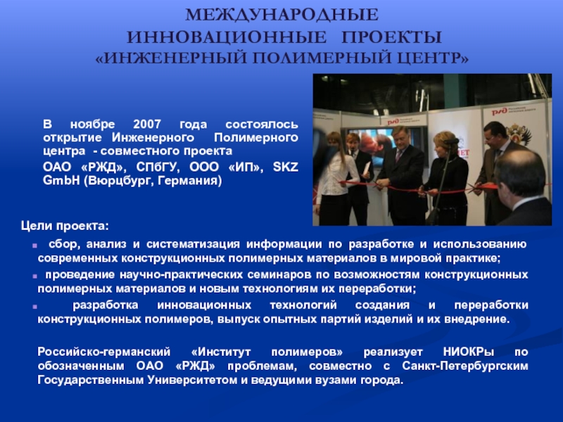 разработка инновационных технологий создания и переработки конструкционных полимеров, выпуск опытных партий изделий и их внедрение.