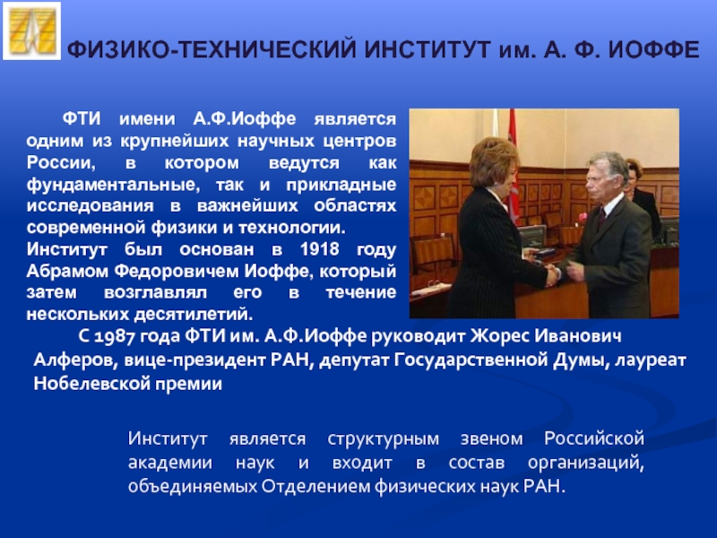 С 1987 года ФТИ им. А.Ф.Иоффе руководит Жорес Иванович Алферов, вице-президент РАН, депутат Государственной Думы, лауреат Нобелевской премии