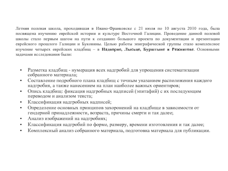 Опись кладбищ: фиксация надгробных надписей (эпитафий) с их последующим переводом и анализом текста;