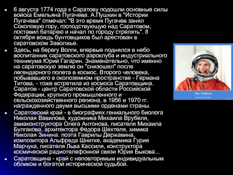 Здесь, на берегу Волги, впервые поднялся в небо воспитанник саратовского аэроклуба и индустриального техникума Юрий Гагарин. Знаменательно, что именно на саратовскую землю он "снизошел" после легендарного полета в космос. Второго человека, побывавшего в околоземном пространстве - Германа Титова, - тоже встретила из космоса Саратовщина. Саратов - центр Саратовской области Российской Федерации, крупного промышленного и сельскохозяйственного региона, в 1956 и 1970 гг. награжденного двумя высшими орденами страны.