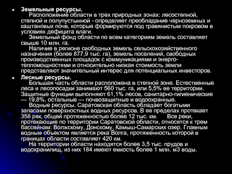 Водные ресурсы. Саратовская область обладает богатыми запасами поверхностных водных ресурсов. В ее пределах протекает 358 рек, общей протяженностью более 12 тыс. км. Все реки, протекающие по территории Саратовской области, относятся к трем бассейнам: Волжскому, Донскому, Камыш-Самарских озер. Главным водным объектом является река Волга, протяженность которой в границах области составляет 420 км.