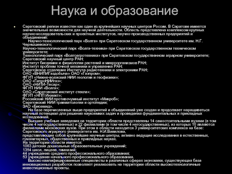России. В Саратове имеются значительные возможности для научной деятельности. Область представлена комплексом крупных научно-исследовательских и проектных институтов, научно-производственных предприятий и объединений: