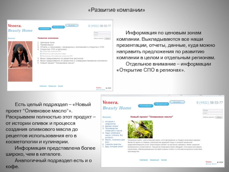 Есть целый подраздел – «Новый проект "Оливковое масло"». Раскрываем полностью этот продукт – от истории оливок и процесса создания оливкового масла до рецептов использования его в косметологии и кулинарии.