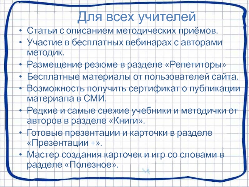 Сайт является площадкой для преподавателей русского языка. Мы предлагаем коллегам объединяться и бороться с безграмотностью сообща. Давайте делиться опытом на вебинарах, описывать эффективные методики работы в статьях, выкладывать материалы для уроков в открытом доступе.