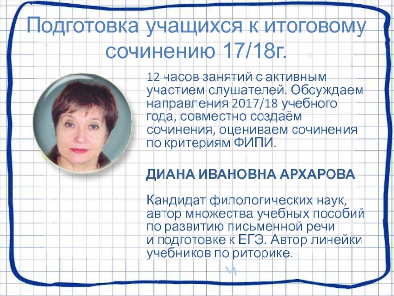 участием слушателей. Обсуждаем направления 2017/18 учебного года, совместно создаём сочинения, оцениваем сочинения по критериям ФИПИ.