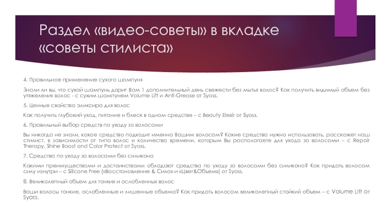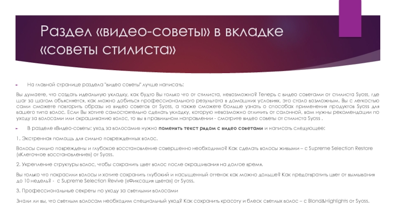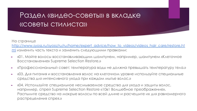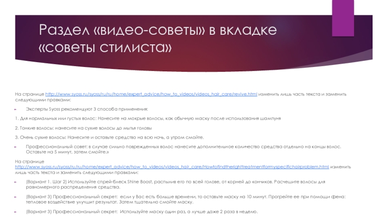 На странице http://www.syoss.ru/syoss/ru/ru/home/expert_advice/how_to_videos/videos_hair_care/Howtofindtherighttreatmentformyspecifichairproblem.html изменить лишь часть текста и заменить следующими правками: