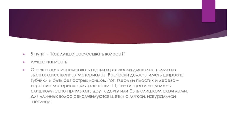 и расчески для волос только из высококачественных материалов. Расчески должны иметь широкие зубчики и быть без острых концов. Рог, твердый пластик и дерево – хорошие материалы для расчески. Щетинки щетки не должны слишком тесно примыкать друг к другу или быть слишком округлыми. Для длинных волос рекомендуются щетки с мягкой, натуральной щетиной.