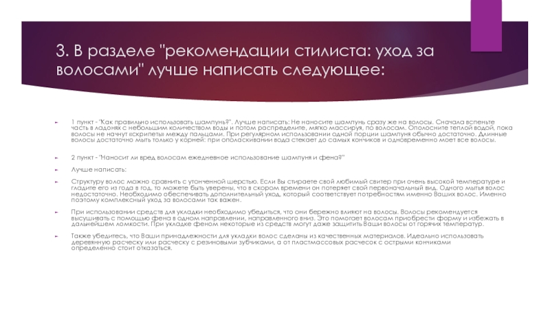 Слайд 83. В разделе "рекомендации стилиста: уход за волосами" лучше написать следующее: