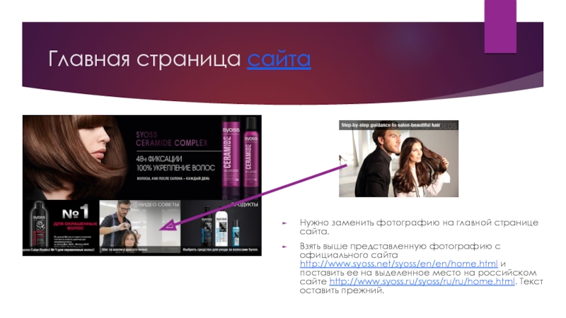 представленную фотографию с официального сайта http://www.syoss.net/syoss/en/en/home.html и поставить ее на выделенное место на российском сайте http://www.syoss.ru/syoss/ru/ru/home.html. Текст оставить прежний.