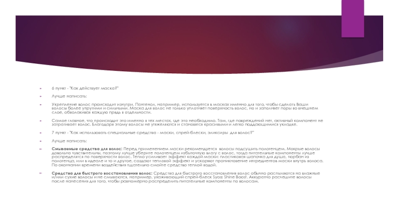 7 пункт - "Как использовать специальные средства - маски, спрей-блески, эликсиры для волос?"