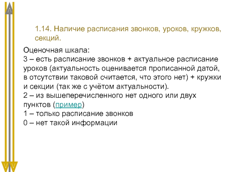 Слайд 141.14. Наличие расписания звонков, уроков, кружков, секций.