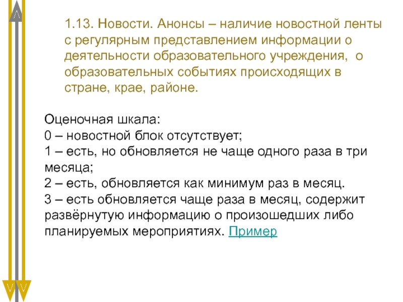 Слайд 131.13. Новости. Анонсы – наличие новостной ленты с регулярным представлением информации