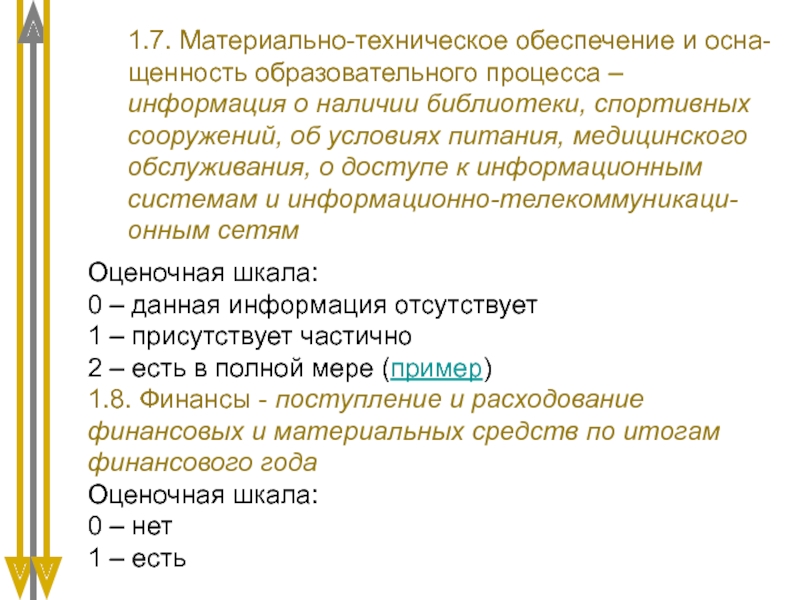 Слайд 91.7. Материально-техническое обеспечение и осна-щенность образовательного процесса – информация о наличии