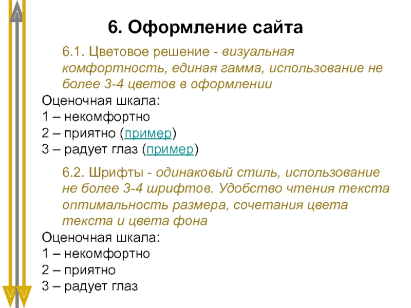 6.2. Шрифты - одинаковый стиль, использование не более 3-4 шрифтов. Удобство чтения текста оптимальность размера, сочетания цвета текста и цвета фона