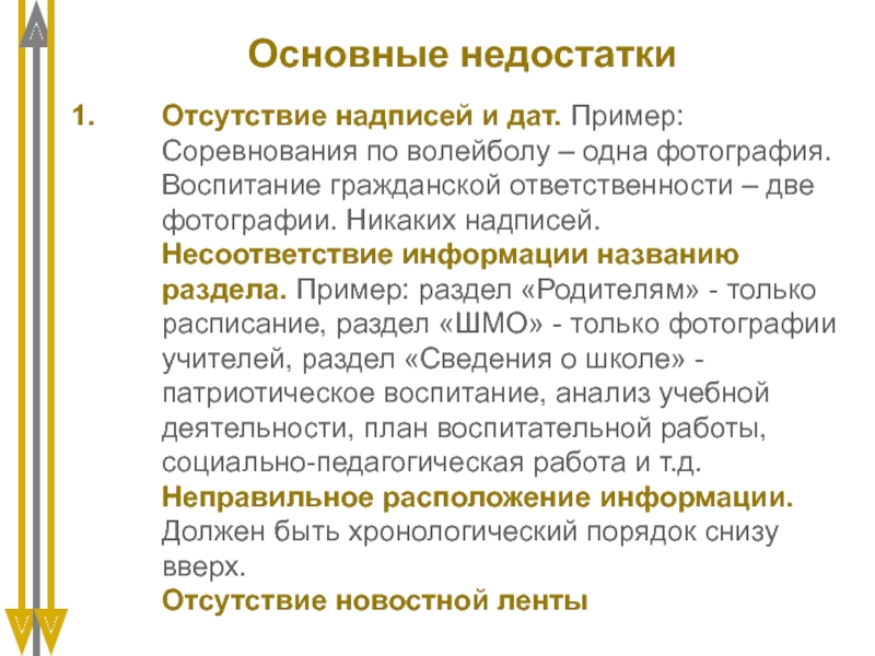 Несоответствие информации названию раздела. Пример: раздел «Родителям» - только расписание, раздел «ШМО» - только фотографии учителей, раздел «Сведения о школе» - патриотическое воспитание, анализ учебной деятельности, план воспитательной работы, социально-педагогическая работа и т.д.