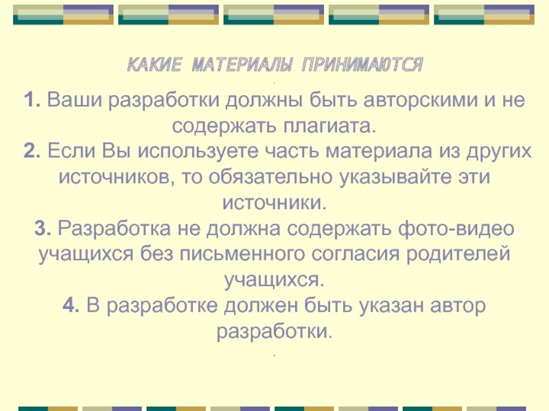 содержать плагиата. 2. Если Вы используете часть материала из других источников, то обязательно указывайте эти источники. 3. Разработка не должна содержать фото-видео учащихся без письменного согласия родителей учащихся. 4. В разработке должен быть указан автор разработки. .