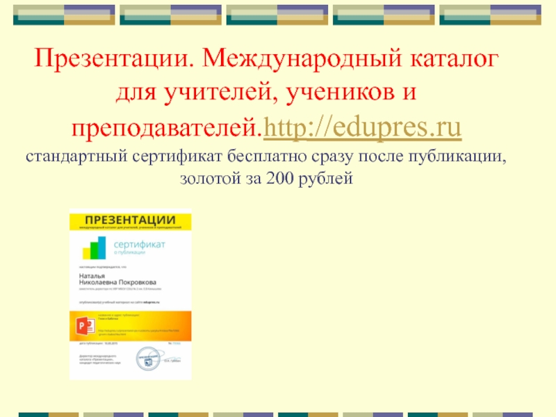 Слайд 9Презентации. Международный каталог для учителей, учеников и преподавателей.http://edupres.ru стандартный сертификат бесплатно