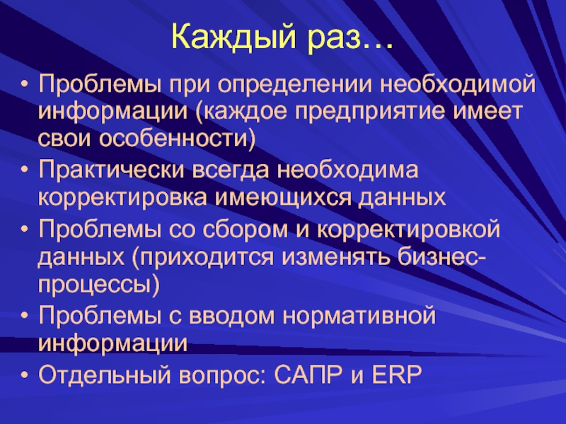 Проблемы при определении необходимой информации (каждое предприятие имеет свои особенности)