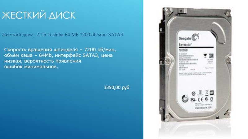 Скорость вращения шпинделя – 7200 об/мин, объём кэша – 64Мb, интерфейс SATA3, цена низкая, вероятность появления ошибок минимальное.