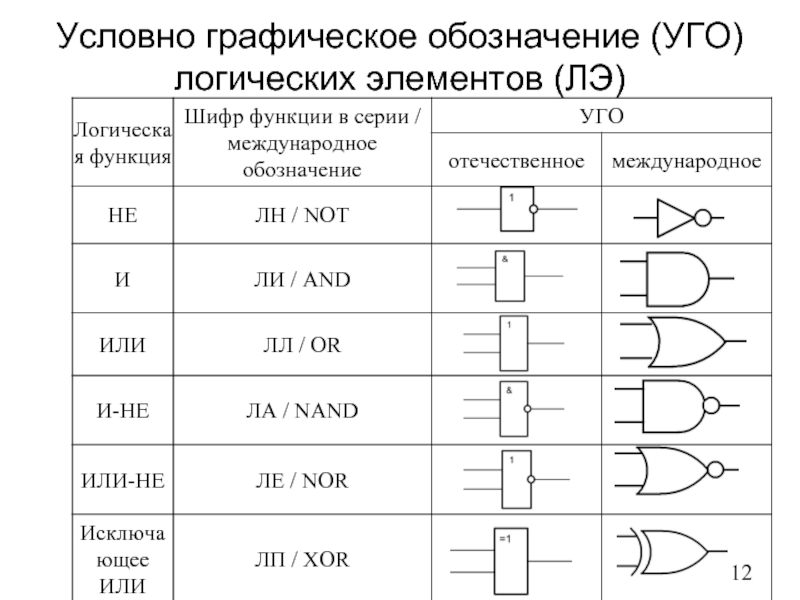 Слайд 12Условно графическое обозначение (УГО) логических элементов (ЛЭ)