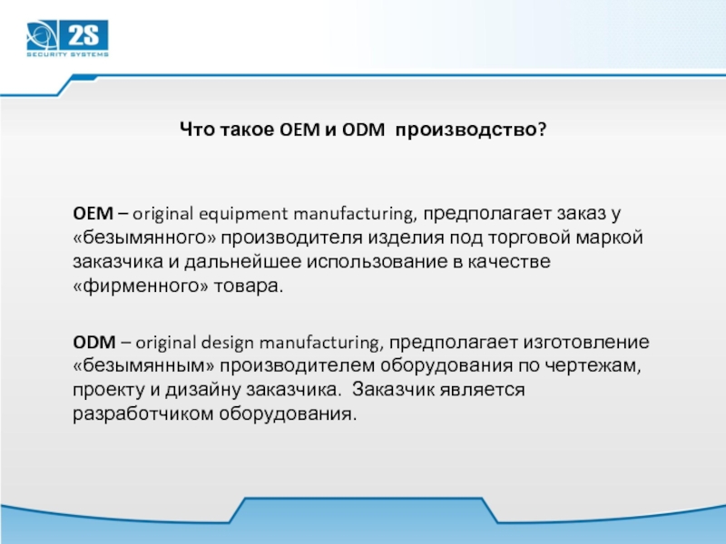 ODM – original design manufacturing, предполагает изготовление «безымянным» производителем оборудования по чертежам, проекту и дизайну заказчика. Заказчик является разработчиком оборудования.
