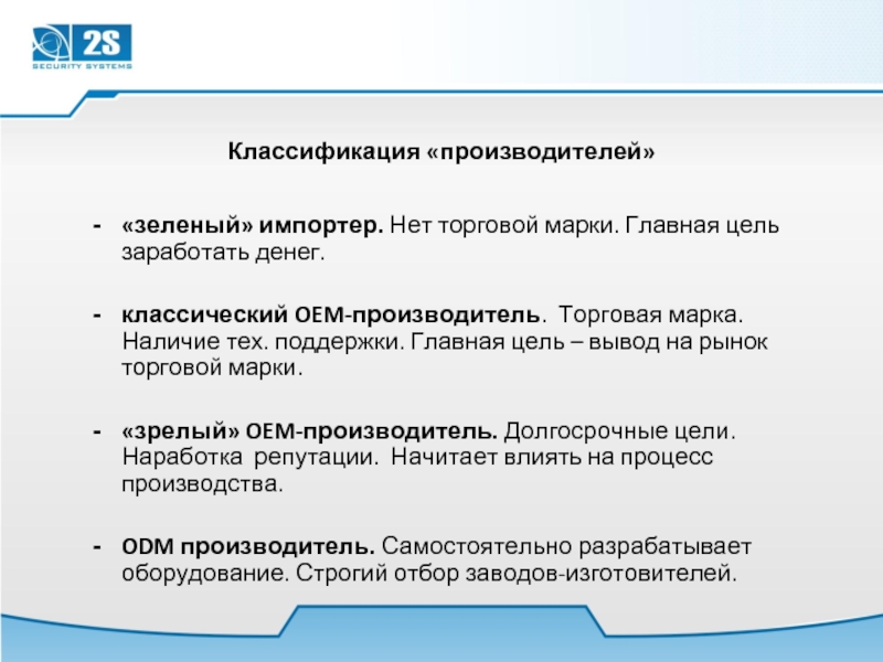 OEM-производитель. Торговая марка. Наличие тех. поддержки. Главная цель – вывод на рынок торговой марки.