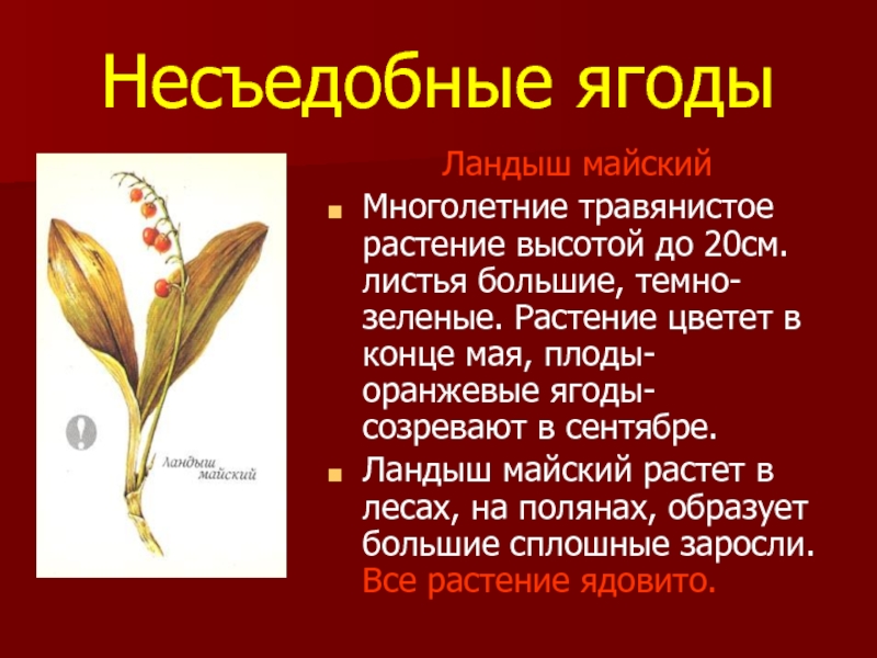 Ландыш майский растет в лесах, на полянах, образует большие сплошные заросли. Все растение ядовито.