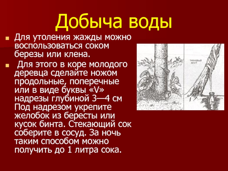 Для утоления жажды можно воспользоваться соком березы или клена.
