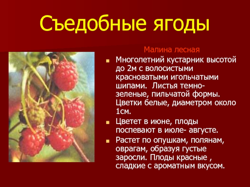 Растет по опушкам, полянам, оврагам, образуя густые заросли. Плоды красные , сладкие с ароматным вкусом.