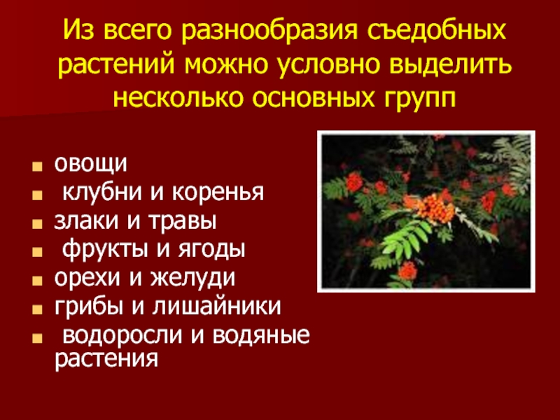 Слайд 15Из всего разнообразия съедобных растений можно условно выделить несколько основных групп