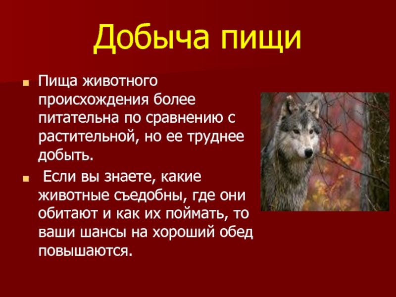 Если вы знаете, какие животные съедобны, где они обитают и как их поймать, то ваши шансы на хороший обед повышаются.