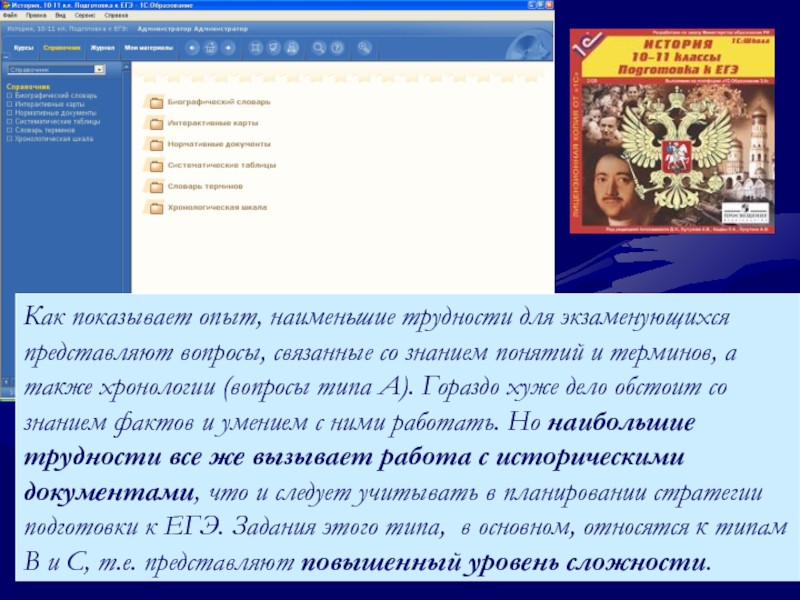 знанием понятий и терминов, а также хронологии (вопросы типа А). Гораздо хуже дело обстоит со знанием фактов и умением с ними работать. Но наибольшие трудности все же вызывает работа с историческими документами, что и следует учитывать в планировании стратегии подготовки к ЕГЭ. Задания этого типа, в основном, относятся к типам В и С, т.е. представляют повышенный уровень сложности.