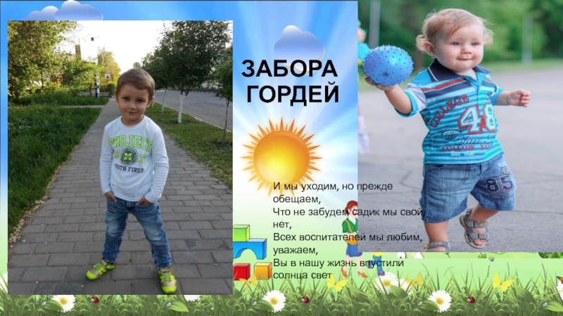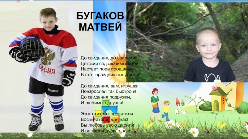 стал для вас лишь первой ступенью. Впереди всех ждет школа, институт, карьерный рост. Надеемся, что мы смогли дать вам хорошую базу, поэтому спокойно отпускаем во взрослую жизнь. В этой группе навсегда осталась частичка вас. Мы всегда будем помнить этот завораживающий смех, все наши совместные утренники и мероприятия! Поздравляем с вашим первым выпускным. Пусть каждого из вас впереди ждет счастливая дорога. В добрый путь!».