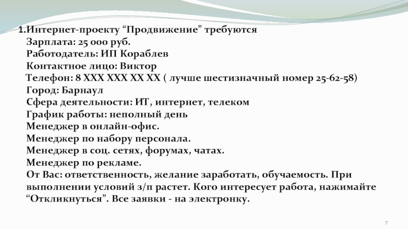 Слайд 7Интернет-проекту “Продвижение” требуются