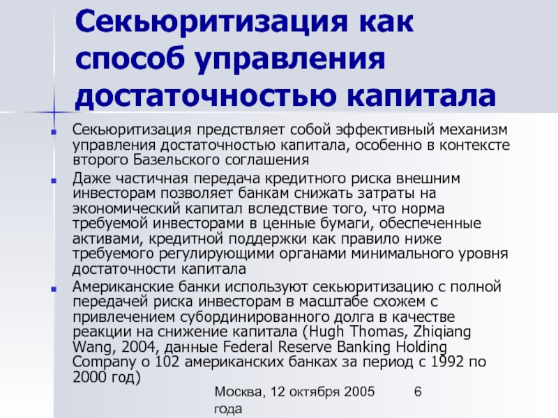 Американские банки используют секьюритизацию с полной передачей риска инвесторам в масштабе схожем с привлечением субординированного долга в качестве реакции на снижение капитала (Hugh Thomas, Zhiqiang Wang, 2004, данные Federal Reserve Banking Holding Company о 102 американских банках за период с 1992 по 2000 год)