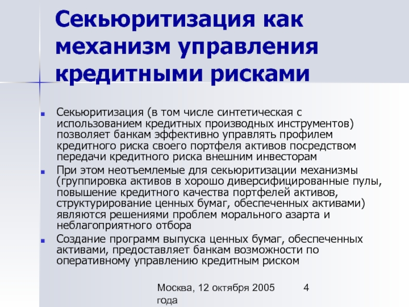том числе синтетическая с использованием кредитных производных инструментов) позволяет банкам эффективно управлять профилем кредитного риска своего портфеля активов посредством передачи кредитного риска внешним инвесторам